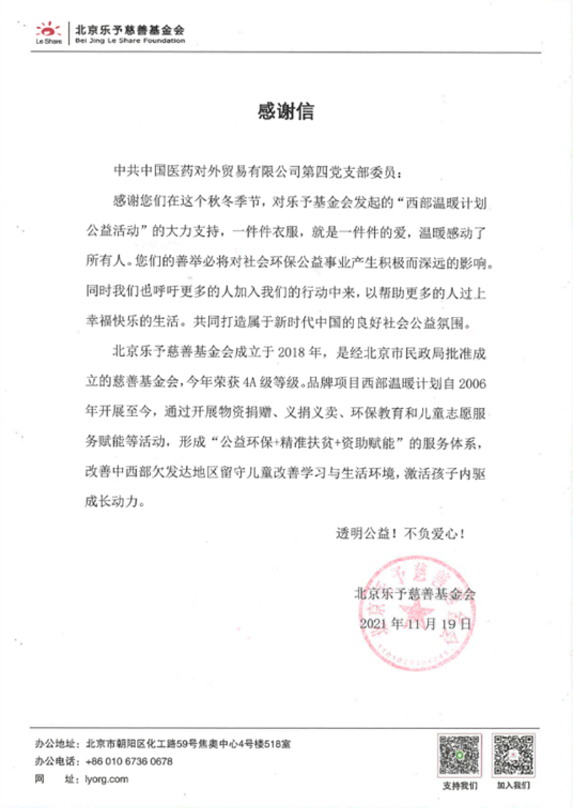 2021年11月,国药外贸第四党支部积极响应公司党委关于“我为群众办实事”总体部署,秉承“汇智于海 走向实处”的服务思想,组织开展向西部爱心捐衣送温暖活动。