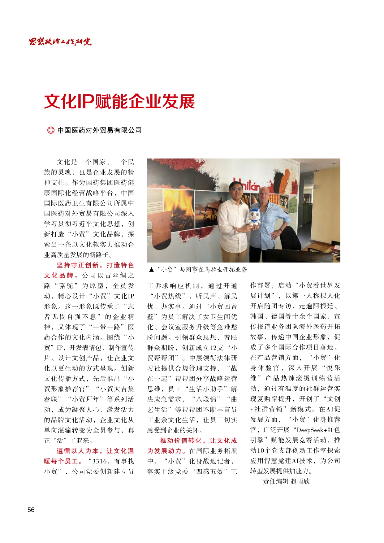 近日,由中共中央宣传部主管的《思想政治工作研究》(2025年增刊)刊发国药外贸思想政治工作创新案例《文化IP赋能企业发展》,介绍国药外贸深入学习贯彻习近平文化思想,认真落实国务院国资委关于加强中央企业思想文化建设的工作要求,高度重视思想文化工作创新实践,精心打造企业IP“小贸”文化品牌的创新经验。